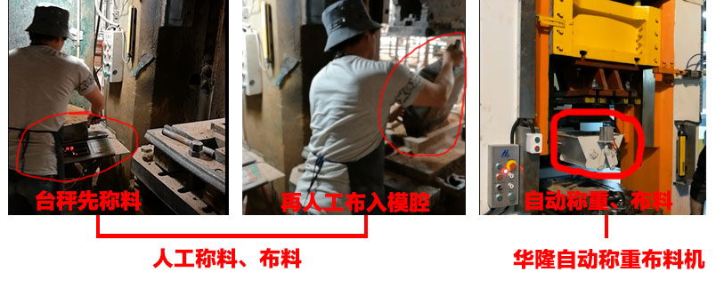 目前在不少耐材企業(yè)內(nèi)看到的還是采用人工布料的。先用搓斗裝料,然后用臺(tái)秤稱,有誤差的話,再手動(dòng)去增減料。